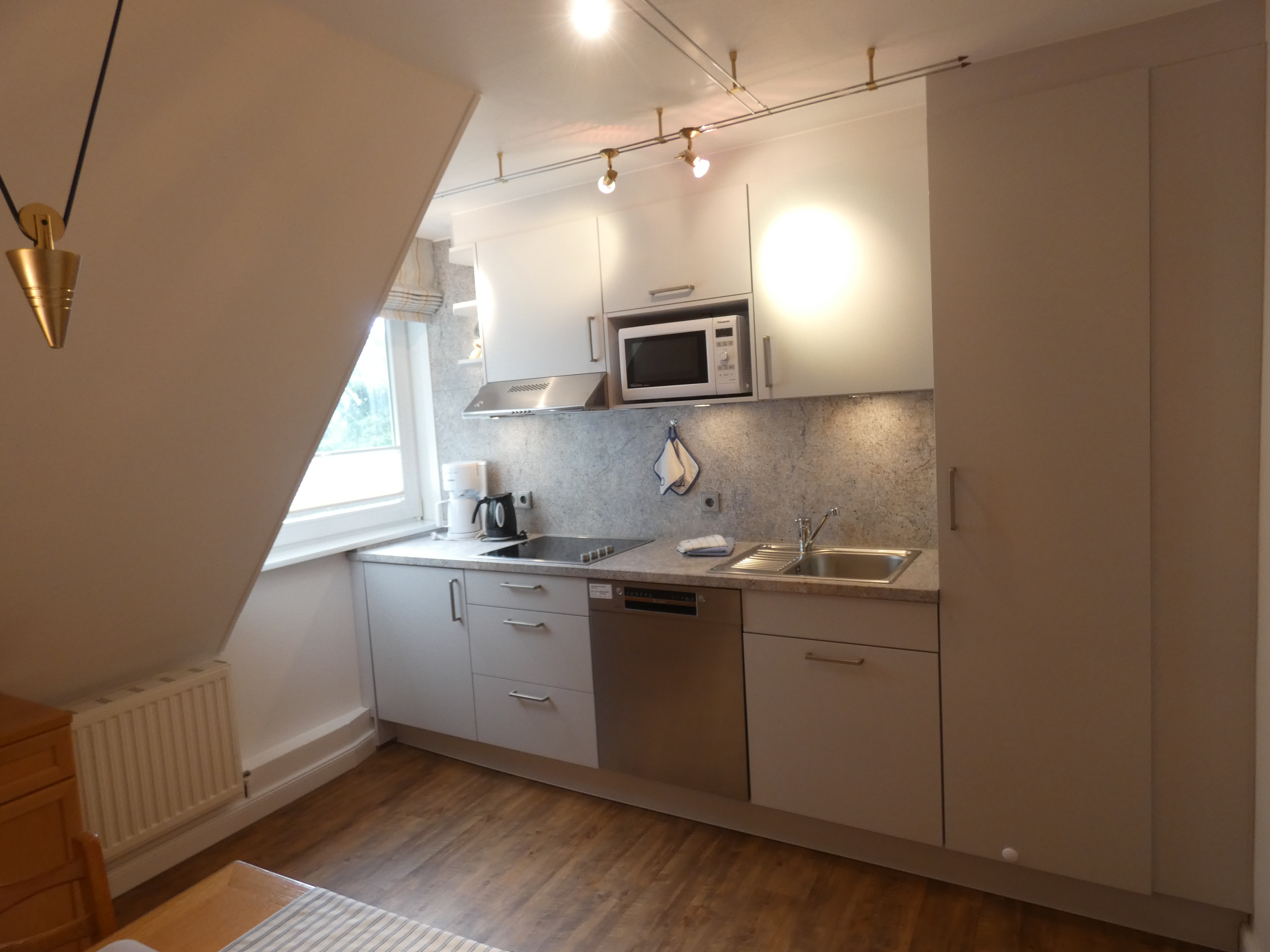 Die gemütlich eingerichtete Küche hat einen Esstisch mit 4 Stühlen, Geschirrspüler, Mikrowelle