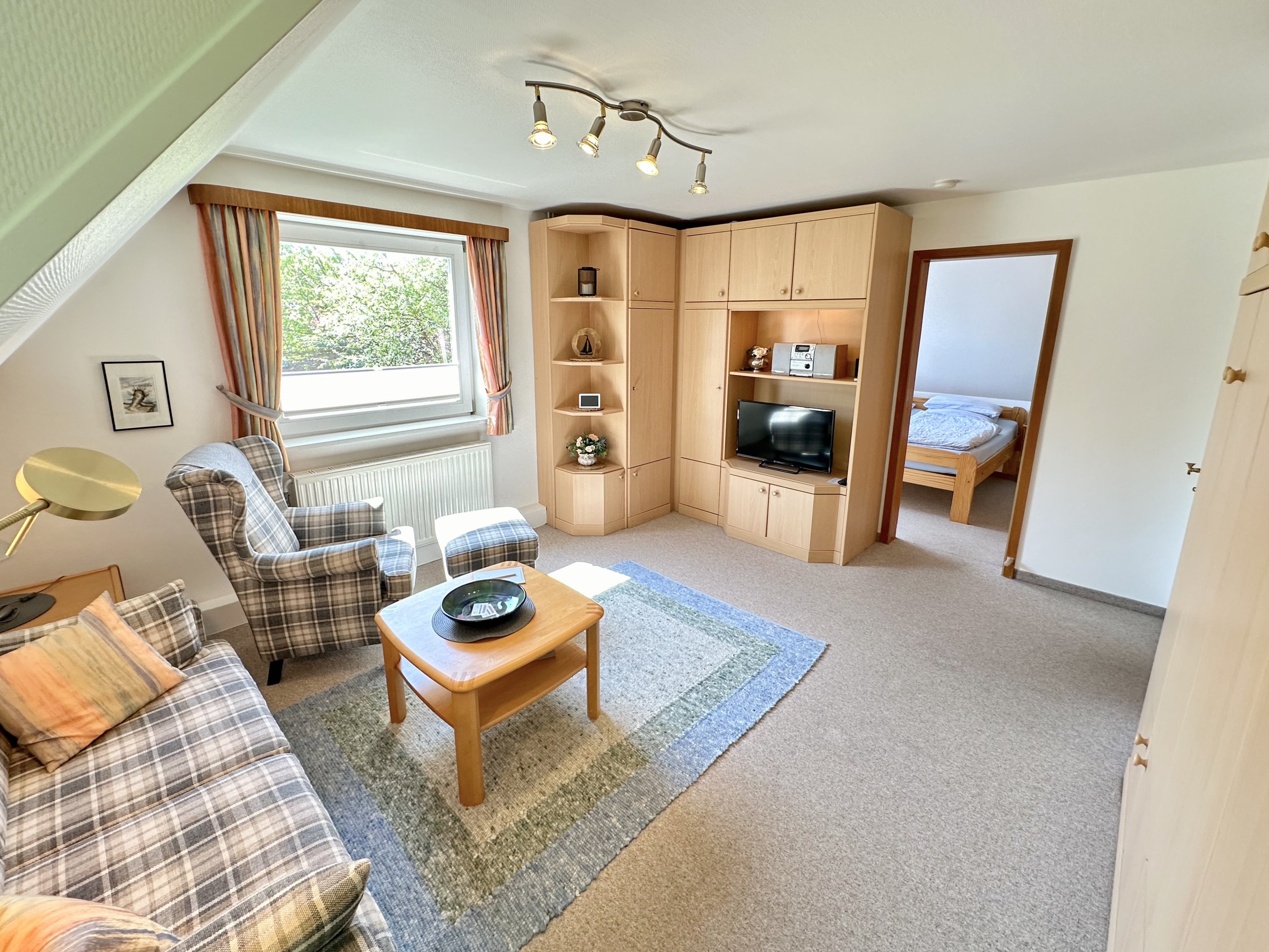 Sie verfügt über einen Wohnraum mit Sitzecke, einem Schrankbett mit zwei einzeln ausklappbaren Betten